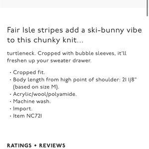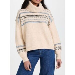 Beautiful fair Isle pattern in a nice cream color. Soft and fuzzy, thick knit turtle neck. Oversized cut, fits me a sz small with room. Manufacturer description in pix. No noted flaws. Wool blend.