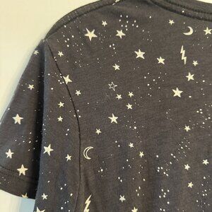 Casual and cool Madewell graphic tee featuring an allover celestial print with moons, stars, and lightning bolts. Classic crewneck style with short sleeves and a relaxed fit. Soft cotton fabric makes it perfect for everyday wear, lounging, or layering under jackets.