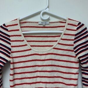 Madelwell Stillman Sweater. Red and blue stripe. Rolled scoop neck. Wide ribbed hem. Mixed stripes. Cotton crepe blend yarn.