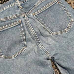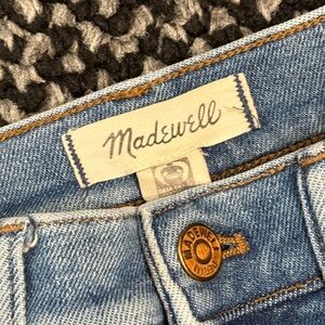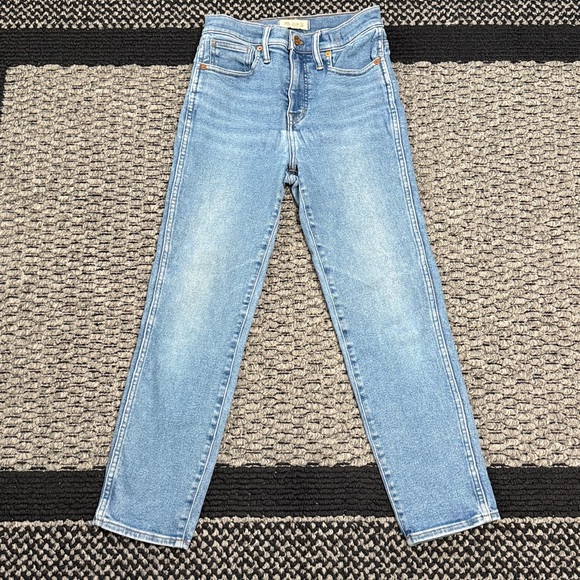 Madewell women’s Stovepipe jeans in a light vintage wash. High rise with a straight stovepipe leg and classic five pocket styling. Structured stretch denim with a button and zip fly closure. Clean, timeless silhouette that works well for everyday wear.