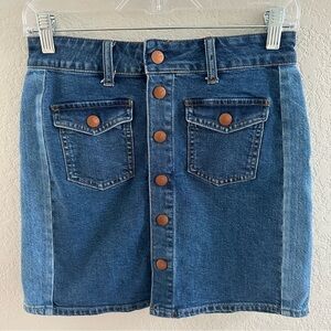 Artfully pieced in two shades of denim, this easy straight mini has flap pockets and snaps all the way down the front. One to wear to every outdoor concert.