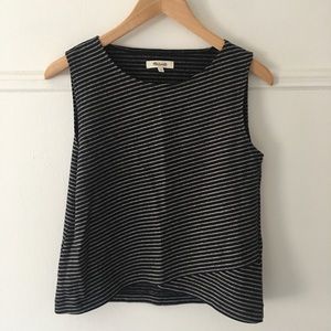 A subtly striped tank top with a cool crossover detail. Strategically cropped to wear with high risers (all while keeping your navel covered).