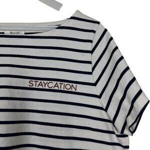 Madewell Embroidered Setlist Staycation Crop Tee. Cut with a cool, boxy shape, this striped tee is embroidered with ‘staycation’ text that encourages you to relax and unwind without leaving your favorite block. Cropped.