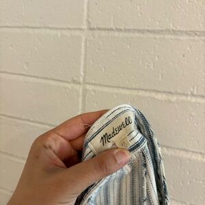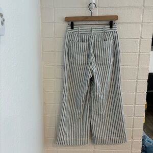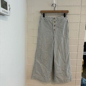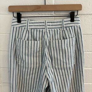 Chic high-waisted pants with blue and white stripes. Features button details. Perfect for casual wear.