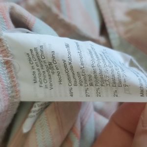 V-neck jumpsuit has puff sleeves. Tapered legs and a tie waist. Made of a comfy linen-cotton blend in textural stripes. Zipper back. Pockets.