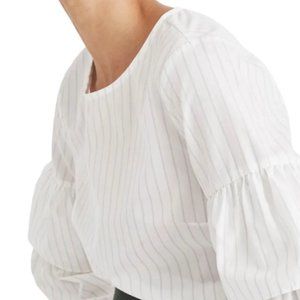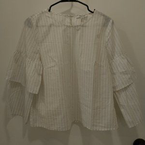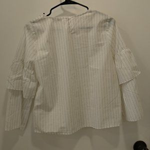 Cute ruffled bell-sleeved madewell blouse with subtle gray vertical stripes