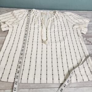 Features: Flowy fit, shirred neckline with ties, short sleeves, stretchy knit fabric