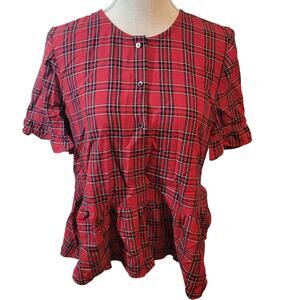 Madewell Studio Ruffle-Hem Top in Clanton Plaid Red/Black Medium Short Sleeve