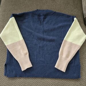 Stay stylish and comfortable with this blue and cream sweater. Perfect for any occasion.Elevate your wardrobe with the Madewell Charleston V-Neck Pullover Sweater. This cozy and stylish sweater features a unique colorblock design in a beautiful blue hue, making it a standout piece that is perfect for any occasion. The V-neckline and pullover style add a touch of elegance and ease, while the regular size small fits perfectly for a comfortable and flattering look.