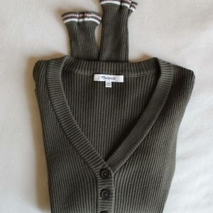 V-neck olive green colored sweater with three buttons and a contrasting pink and white stripe at cuffs