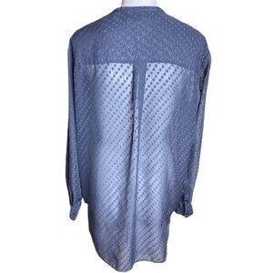 Beautiful sheer Madewell blouse in Ice Leaf Gray with a velvet/burnout dot pattern, two breast pockets, a high/low hem (lower at the back) and a neat box-pleat at the back. Sheer, airy and feminine with a mandarin collar