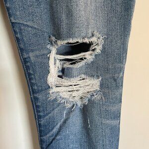 Color: Mid Blue with destruction at both knees, upper left pocket, and back right pocket. Heavy whiskering at the back knees(see picture)