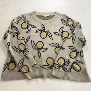 Madewell Tangerine Sketch Jacquard Pullover Sweater in heather taupe with yellow citrus motif. Soft knit with crew neckline and relaxed fit. Fun, whimsical print that pairs perfectly with denim or layered looks.