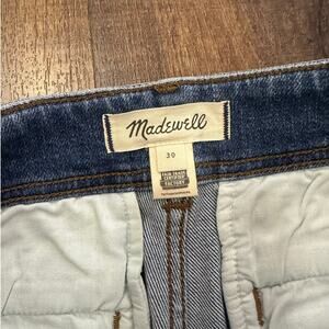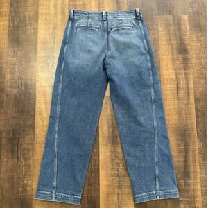 jeans have tapered legs, slant pockets, a side panel and welt back pockets.
