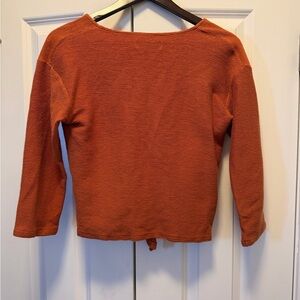 Chic terracotta blouse with a flattering V-neck. Features a stylish tie front. Ideal for versatile styling.