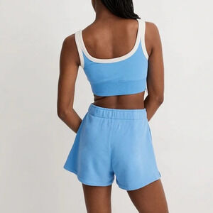 The fabric: lightweight and airy terry that's made from a cotton blend. The fit: a bralette-style tank with contrasting tipping and a ribbed hem. The set: try it with the matching shorts or sweatpants.