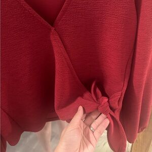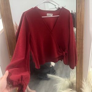 Beautiful crimson red wrap top. Comes with a button closure, and beautiful tie on the bottom of the wrap. No flaws, amazing condition.