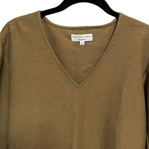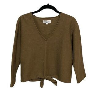 Madewell Texture & Thread Long Sleeve Tie Front Top. Olive color. Tie front waist hem detail. Ottoman jacquard. Regular fit. 100% Cotton. 3/4 length sleeves. V neckline.