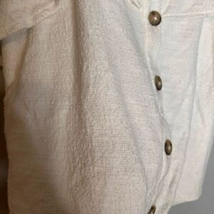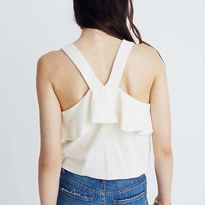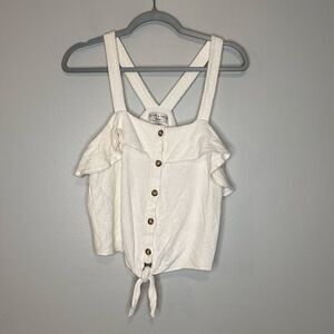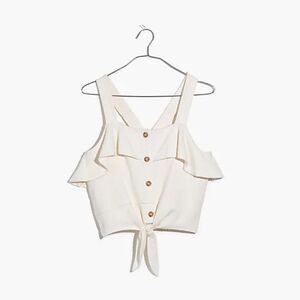 Size S. Bouclé texture. Inspired by the idea that everything should be as comfy as a tee, our new Texture & Thread collection combines truly touchable fabrics with pulled-together shapes. This dressed-up tank top is a triple threat with a button front, a tie detail and a sweet ruffle (cute enough to go out in, we think).