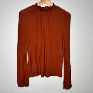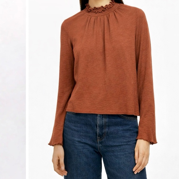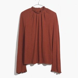 '70s-inspired feminine top has a ruffled mockneck and lettuce-edged bell sleeves.
