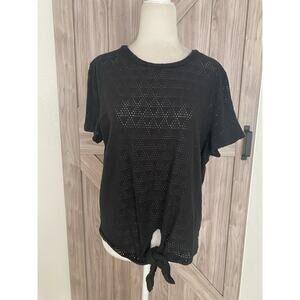 Black tie front short sleeve geometric eyelet fabric