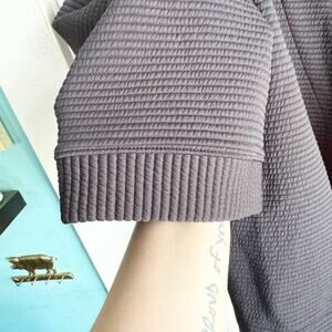 Madewell Texture and Thread Open Front Textured Caridgan Jacket Oversized Size Medium {M}. Jacket was sold with a fabric belt, but this jacket is missing the belt. Horizontal knit linear textured pattern. Navy. Side slit pockets. Drop shoulder style. Good, preowned condition. Polyester/Elastane. Machine wash. Tumble dry.