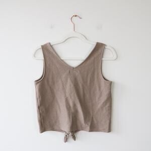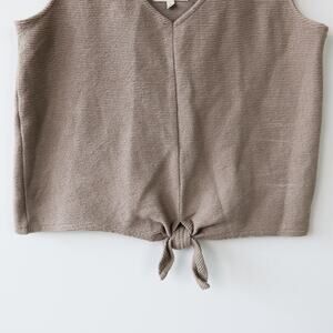 Cute and casual tie front, vneck tank in a taupe brown color. Perfect for a boho or cottagecore look, pair with wide leg jeans for a casual dinner outfit or layer over a long sleeve top for cooler weather.