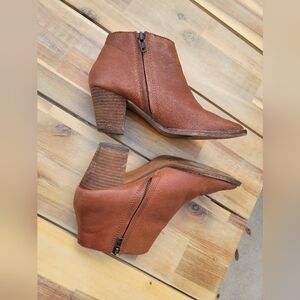 Worn, brown leather ankle boots with chunky stacked heels. Hidden zipper enclosure. Rounded, pointed toes.