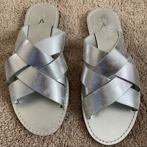 Metallic silver slip on slide sandals from Madewell. Crisscross design adds fun detail to these burnished silver sandals. Dress them up or dress them down! New without tags.