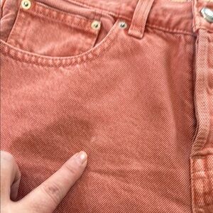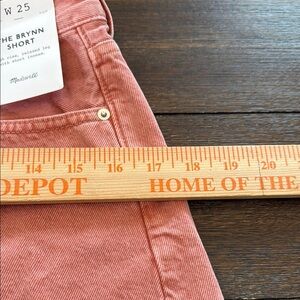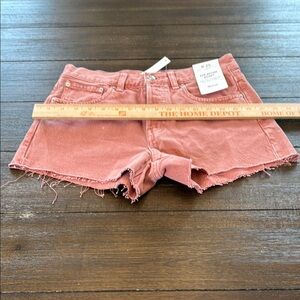 high-rise jean shorts feature a mid-length inseam and raw-edge hem. Garment dyed for richly saturated color.