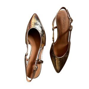 Metallic Gold Madewell Pointed Toe Slingback Heels With Adjustable Strap & Kitten Heel