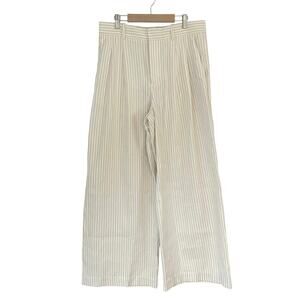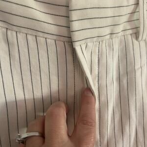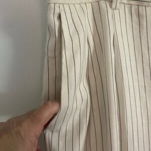 Features: Wide leg, slant front pockets, welt back pockets, zip/hook/button closure, ivory with black pinstripes, linen/cotton/viscose
