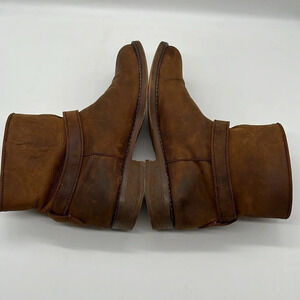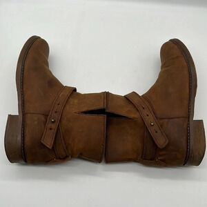 Madewell The Lowrider Biker Boot Weathered Leather in Apple Butter - Size 7. Excellent pre-owned condition. Very little wear evident. These were extremely well cared for. Little bit of toe rub on the left boot and soil on the bottoms. There is some creasing from wear but nothing drastic. Normal wear in my opinion. These are a pull on style. Leather uppers and insoles, man made soles. 1" heel. Weathered appearance is manufactured. Ankle straps are adjustable. Style number 03824.
