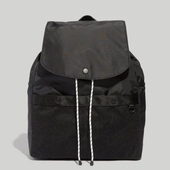 NWT. Designed to go with MWL workout gear, this roomy backpack has snap-close mesh pockets in front and an O-ring to snap your keys on. Made of sturdy (Re)sourced recycled ripstop nylon, it has an adjustable drawstring closure (so you can really keep that sweaty tee under wraps).