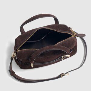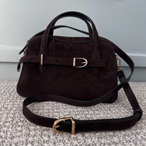 Crafted from a gorgeous and rich brown suede, this mini crossbody bag has a slender buckle strap and secure top zipper.