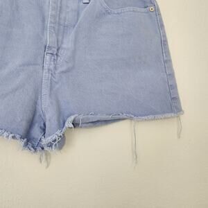 In excellent pre-owned condition, a pair of Madewell The Momjean high rise cutoff shorts in light blue denim. Features classic five-pocket styling, raw cutoff hem, and button fly closure.