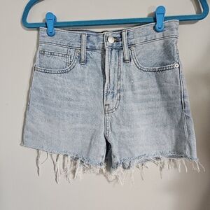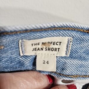 Madewell Rhe Perfect Jean Short. Light blue denim shorts are perfect for casual outings. Intentionally frayed hem. Pockets. Working zip. Enjoy comfort and fashion with these versatile shorts. In great pre-loved condition! Size 24