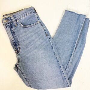 Madewell jeans, vintage fit, distressed denim, size 28 jeans, raw hem jeans, straight leg, high rise jeans, sustainable denim, light wash, The Perfect Vintage Jean, women’s jeans
