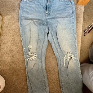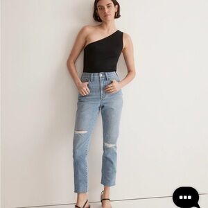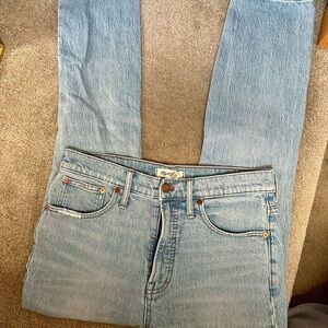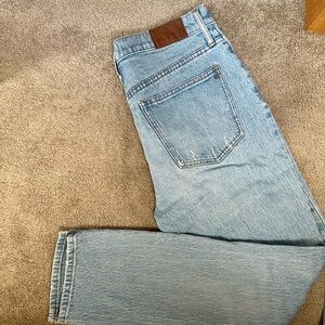 These blue jeans from Madewell offer a stylish ankle-cropped fit with natural distressing for a modern, relaxed look. The light blue wash adds a vintage touch, making them perfect for everyday wear.
