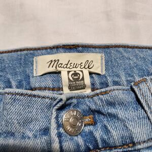 Blue denim straight legged high rise jeans from Madewell. Features distressed look and frayed hem. Women's size 30, stretch for comfort. In good pre-loved condition!