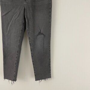 Features: zip fly with button closure, front and back pockets, belt loops, high rise, tapered leg, mom jean, intentional distressing, cotton blend