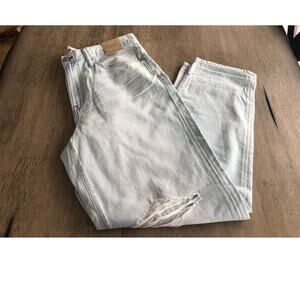 This pair of jeans is perfect for a cool and casual laid-back look. They are a slouchy boyfriend fit that sits low on the hips. They have a relaxed fit throughout and can be easily dressed up or down. It is a lightweight fabric made of 100% Cotton, they do not have stretch. They are distressed throughout. There is one very small spot, please see the photo, I believe a good wash will get the spot out. Classic five-pocket design with zipper and button closure. New with tags.