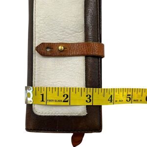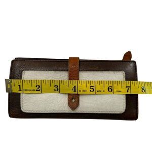 Minor scuffs on leather, consistent with gentle use. Some slight discoloration of white leather. Front width = 7.5 inches, height = 3.5 inches.