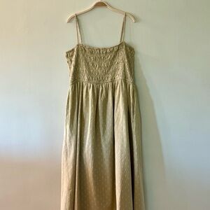 Like new! Color is lovely pale green (“lichen”). Material is a heavier jacquard 100% cotton Skirt is lined. Has pockets.