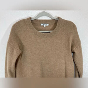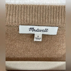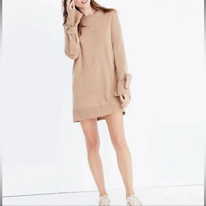 Madewell Tie Cuff Sweater Mini Dress 100% Merino Wool Camel Tan Women’s Size Small. Pullover style, round neck, long sleeve. Made in China. Style #G9643. Dry clean.