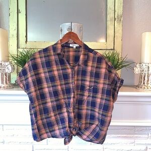 Madewell Tie Front Peach & Navy Plaid Boxy Button Down Top Like New Medium.