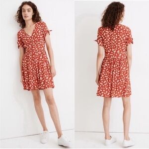 Madewell rusty red swing dress. Charming floral dress with tie-sleeves. Button-front design. Vibrant red and orange hues. Happy hibiscus print.