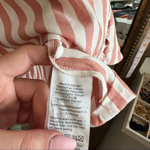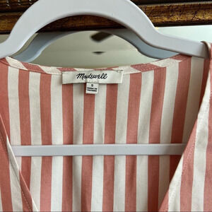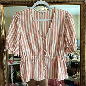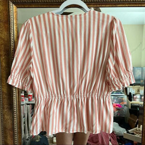 In stripey lightweight cotton, this feminine, easy-to-wear V-neck popover top has vintage-y covered buttons and a flattering (and comfy) elastic peplum waist.