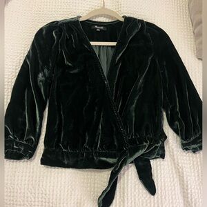 Elegant velvet wrap jacket by Madewell in a deep forest green. Features a stylish tie closure.