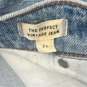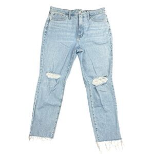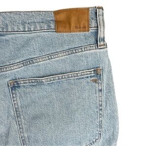 The Madewell Vintage Straight Jean in Danby Wash is a stylish and trendy pair of jeans in size 31. Made from a comfortable cotton blend denim, these jeans feature a solid blue color with a light fabric wash. The knee-rip edition adds a unique and edgy touch to the classic design, while the high-rise waist and regular fit ensure a flattering silhouette. With distressed accents like fringe, button, and zipper, these jeans are perfect for a casual yet fashion-forward look.